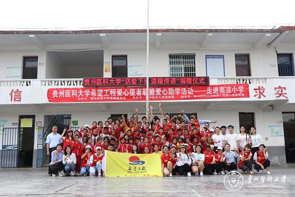 5月17日,由团省委、贵州省青少年发展基金会、太阳成集团tyc33455cc官网校团委主办,太阳成集团tyc33455cc官网希望工程爱心使者联盟承办的“爱心下乡,温暖传递”爱心助学活动在贵阳市开阳县城关镇南凉小学举行。本次活动由校团委志愿工作者部副部长李牧、校团委李歆鑫老师带队,活动捐赠前期在校通过爱心手工义卖等活动募捐筹集所得的书包92个、课外读物600余本、童装7箱,以及文具和各类爱心礼物若干。