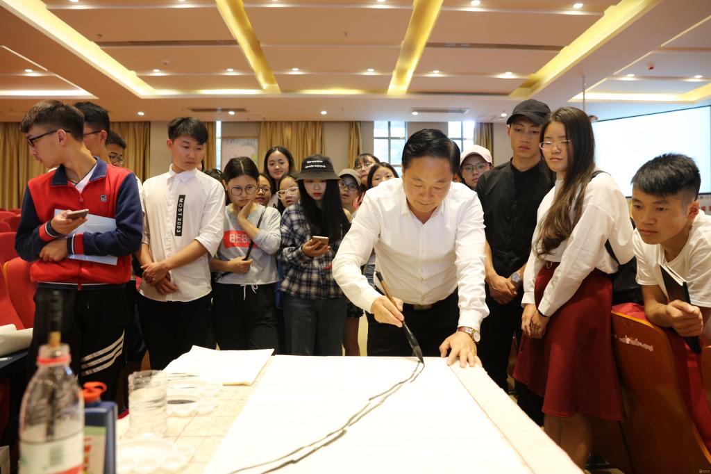 一番名画鉴赏后,吴大明来到同学中间现场作画,把讲座的热烈气氛推入高潮。他边与同学互动边创作,仅仅一瓶墨汁、三支毛笔,只见毛笔在纸上肆意挥舞,一张栩栩如生的芭蕉叶似乎正要迎风而动,三只灵动的小燕子在芭蕉叶下方飞过,芭蕉叶旁的竹叶显得娇小可人,短短几分钟,一幅《似曾相似燕归来》的水墨画就完成了。现场响起了热烈的掌声,大家无不感慨,仅用这么单一的颜色,便能画得如此精妙,中国的水墨画博大精深,精妙绝伦。吴大明并将此画赠予太阳成,希望大家都能进一步了解和认识中国传统文化的深厚内涵,传承和发扬中国传统文化。