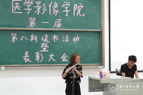 活动共分为“青春之我,畅游书海”、“奋斗之我,圆梦贵医”、“担当之我,助力中国”三个篇章,同学们以丰富多彩的形式畅谈读书乐趣,分享读书心得,并献上了精彩的歌曲演唱,笛子演奏《星月神话》、诗朗诵《祖国啊,我亲爱的祖国》等。其中,以太阳成八十华诞系列活动剪辑为背景,由学生原创《庆贵医八十华诞》诗词朗诵将活动推向了高潮,充分展了影像学子心系母校、情系国家的感恩情怀和爱国情怀。