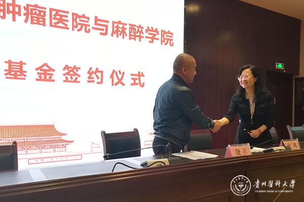捐赠仪式上,饶立代表麻醉学院与捐赠方代表金凤签订捐赠协议。