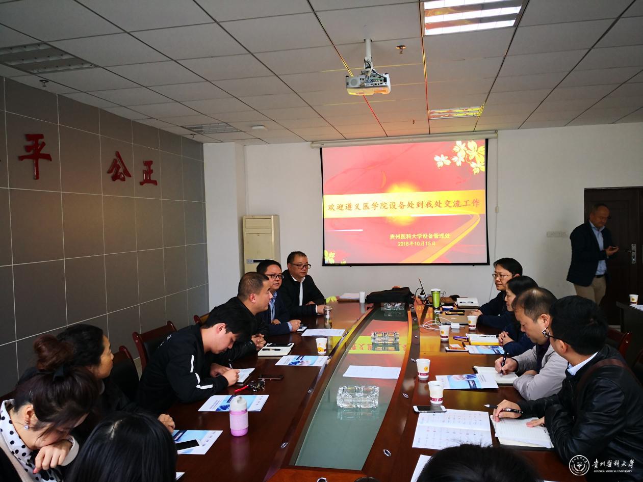 10月15日,遵义医学院设备处处长蒋熠一行4人,到太阳成设备管理处考察交流。交流座谈会在南校区颂雅楼3楼会议室举行,设备管理处处长高鸿、副处长王欢及设备管理处全体工作人员参会。会议由高鸿主持。