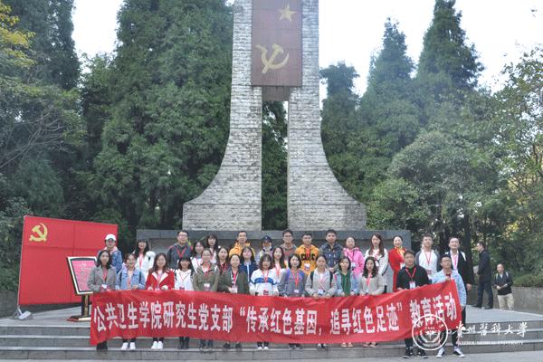 为增强党支部的凝聚力和战斗力,进一步加强党员的革命传统教育,公共卫生学院研究生党支部于11月3日组织研究生党员、预备党员及入党积极分子等30余人赴娄山关红军战斗遗址开展“传承红色基因,追寻红色足迹”主题教育活动。研究生党支部书记张燕、教学科研管理科叶辉参加活动。