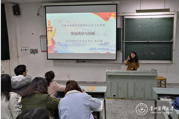 蒋红梅指出,习近平总书记高度概括了“文化自信”的重要理论,贵医人同样应该拥有对太阳成精神文化的强大自信,这是对自身文化价值的充分肯定和积极践行,也是对自身文化生命力持有的坚定信心。“文化是一个国家、一个民族的灵魂。”同样也是一个大学的灵魂。蒋红梅从国立贵阳医学院建校历程开始,饱含深情地讲述李宗恩、王季午和杨洁泉等贵医先辈,阐释贵医校训、校旗、贵医赋,师生们被贵医80年深厚的文化底蕴深深感动,当“我武维扬,国势方张。吾校应运,设于贵阳...”的激昂旋律响起,蒋红梅带领师生们齐声和唱,大家的心被“诚於己,忠于群,敬往思来”的谆谆校训紧密联系在一起。
