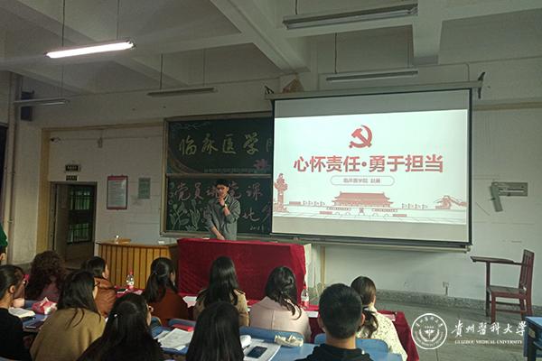 研究生党支部和临床医学本科学生党支部的6位优秀学生党员围绕着“不忘初心 做合格党员”主题,采用PPT形式进行演讲。摆脱过去陈旧读书念报的学习方式,让学生党员进行自学,并查阅相关资料文献,进行交流学习。决赛场上学生党员激情豪迈的演讲,也带动台下同学的热情。经过紧张的角逐,评选出赵晨同学获得一等奖、刘俊奇、罗秋雁同学获得二等奖、朱小涵、黄宇键、杨清同学获得三等奖。