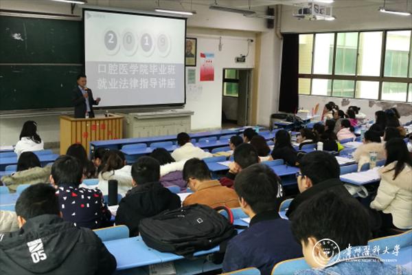 为进一步增强毕业生在就业择业过程中的自我保护意识,学习和掌握就业择业过程中的相关法律、法规、政策,3月12日,口腔医学院邀请贵州中创联律师事务所专职律师包义晋,为毕业生开展就业法律知识专题讲座。口腔医学院党委副书记钱禾,学生管理科负责人张婷,2019届毕业生100余人参加讲座。