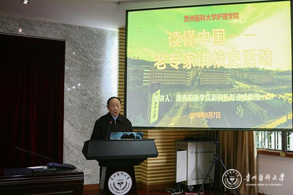 为了教育引导青年学生坚定“四个自信”,增强对中国特色社会主义的思想认同、情感认同和价值认同,5月7日,护理学院在北校区道德讲堂开展“读懂中国—老专家讲校史”活动。活动特邀原贵阳医学院副院长刘迪成教授作报告。护理学院党委书记杨英、院长贾秀英、副院长刘志燕及有关教师、研究生、本科生同学聆听了报告,活动由护理学院党委副书记王秀红主持。