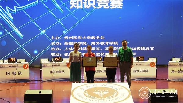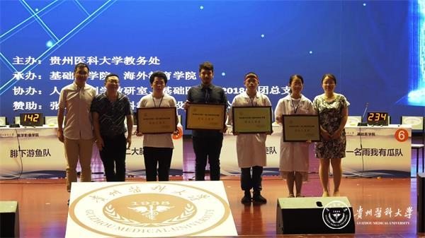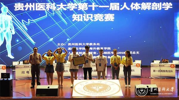 本次竞赛有留学生参与,全程双语进行,外教Ram、专业解剖老师及临床学生担任主持,今年新增加的箱内摸骨环节较好地考察医学生对于骨骼结构的了解,也是本届知识竞赛的一大亮点。比赛特邀请到余资江、贵航300医院骨科主任田广、贵阳市第四人民医院手外科副主任季亮、人体解剖学教研室副主任孙宝飞、人体解剖教学中心副主任肖朝伦、人体解剖学教研室罗时鹏担任评委。49名选手组成7支参赛代表队及智囊团,通过独闯奇关、共度险关、勇闯难关、箱内摸骨、巅峰对决五个环节激烈角逐,第一名雨我有瓜队(基础医学院)获一等奖,闪电队(基础医学院)、一二大脑风波队(儿科学院)获二等奖,Team of Warriors(海外教育学院)、牙牙乐队(口腔医学院)、腓下游鱼队(医学影像学院)、提灯天使队(护理学院)获三等奖。