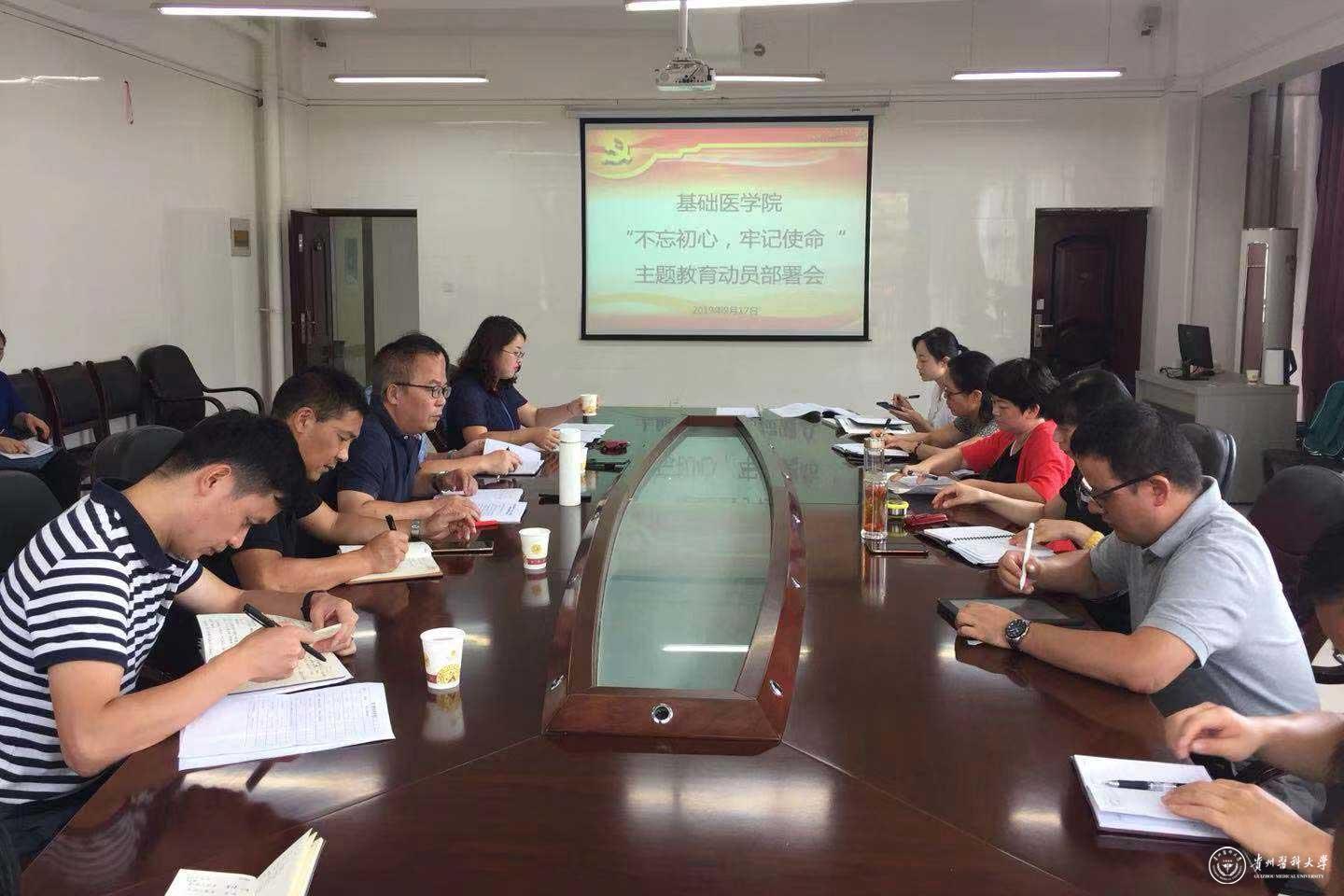 9月17日,基础医学院在南校区务本楼W201会议室召开“不忘初心、牢记使命”主题教育工作动员部署会。基础医学院院长曾柱,副院长刘杰麟、副院长张春林,学校主题教育第二督导组成员雷豪,基础医学院副科级以上干部、党支部书记、主题教育工作组全体成员参加会议,会议由基础医学院党委副书记王妤煜主持。