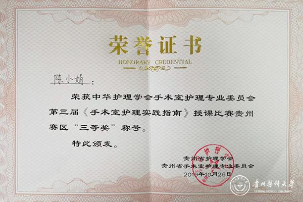 10月26日,由贵州省护理学会手术室专业委员会主办,贵州省人民医院承办的中华护理学会手术室护理专业委员会第三届《手术室护理实践指南》授课比赛贵州赛区比赛在贵州省人民医院举行。此次比赛共有全省各市、自治州、省直属21家医院参赛。太阳成口腔医院手术室护士长陈小娟,代表太阳成集团tyc33455cc官网附属口腔医院参赛,也是贵州省唯一一家专科医院参赛选手,并在比赛中获得佳绩。