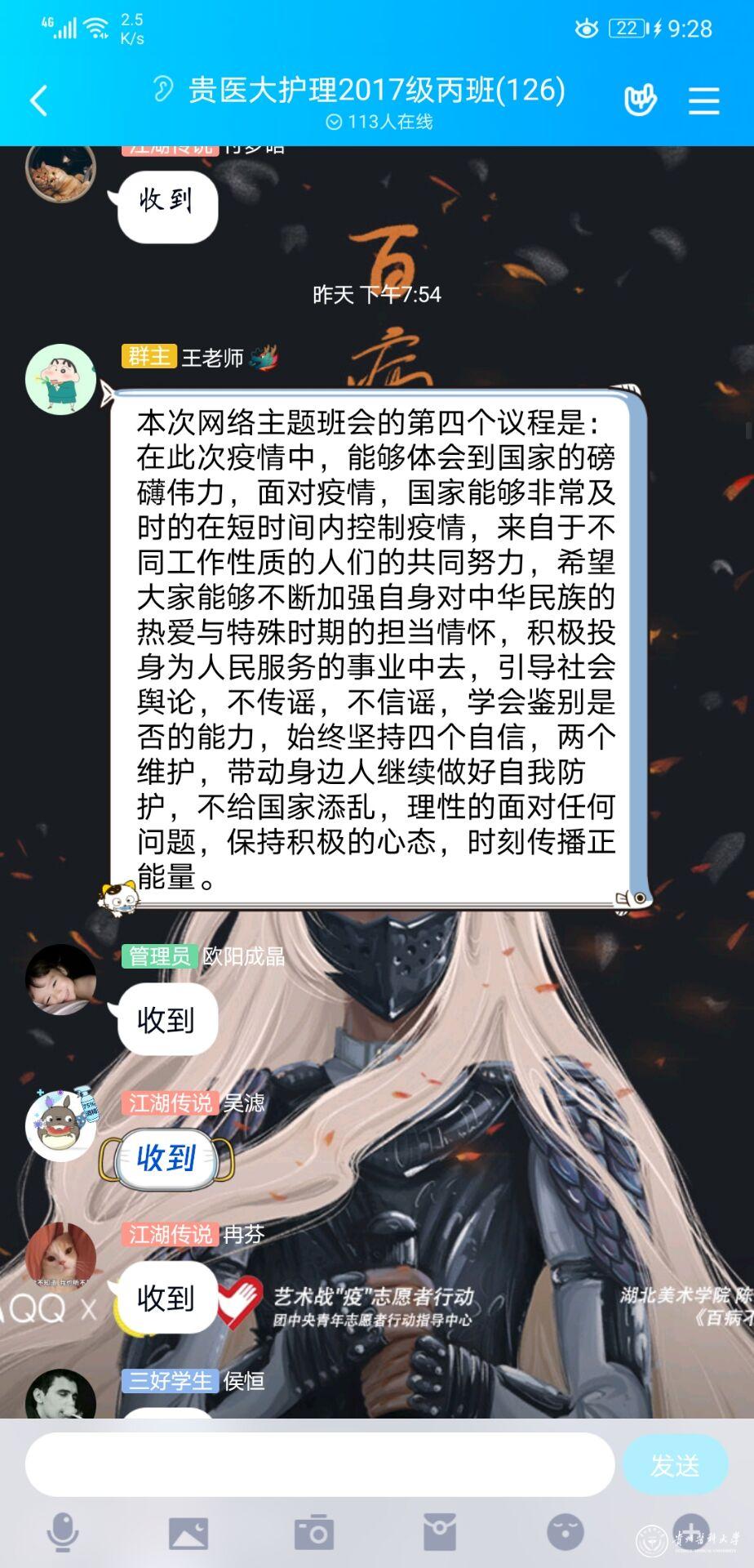 为了贯彻落实《太阳成集团tyc33455cc官网在新冠肺炎疫情防控期间加强思想政治教育的工作方案》通知的要求,做好假期的学生思想政治教育工作,2月25至3月1日,护理学院全体辅导员通过QQ群、微信群、视频会议、召开主题班会等形式为全院本科生、研究生开展“抗疫”主题网络思想政治教育。