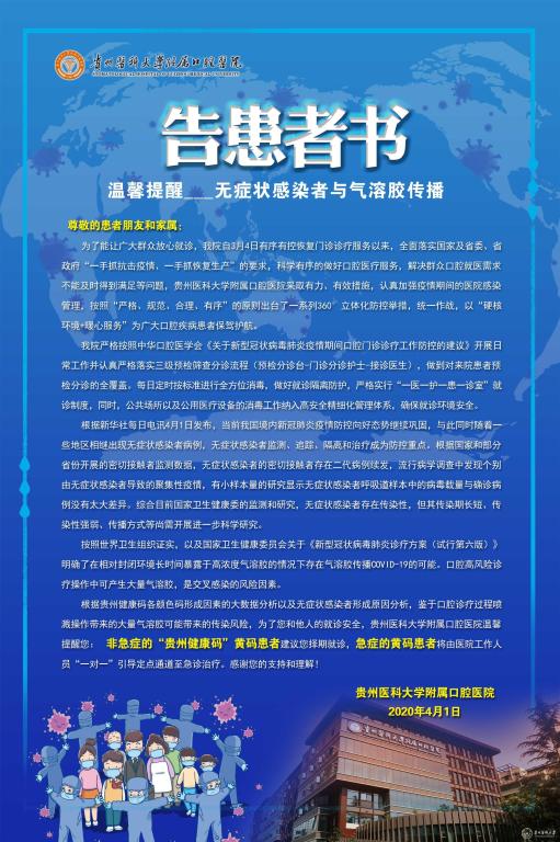 根据贵州健康码各颜色码形成因素的大数据分析以及无症状感染者形成原因分析,鉴于口腔诊疗过程喷溅操作带来的大量气溶胶可能带来的传染风险,为了您和他人的就诊安全,太阳成集团tyc33455cc官网附属口腔医院温馨提醒您:非急症的“贵州健康码”黄码患者建议您择期就诊,急症的黄码患者将由医院工作人员“一对一”引导定点通道至急诊治疗。感谢您的支持和理解!