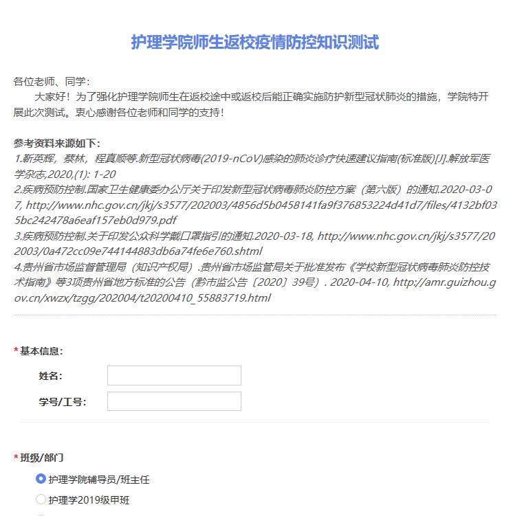 为精准落实新型冠状肺炎疫情防控政策,落实好疫情防控工作,确保学院师生返校复工复学工作安全、稳妥、有序进行,护理学院近期重点针对辅导员、班主任及全体在校生开展了师生返校疫情防控知识测试,以强化师生在返校途中及返校后正确防护新冠肺炎传播、实施有效的防护措施。