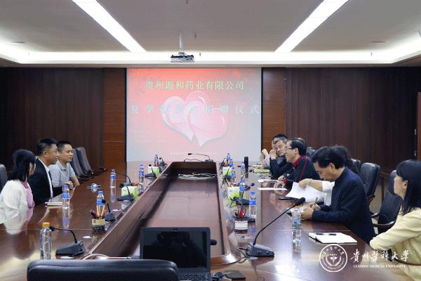 5月27日,贵州源和药业有限公司在太阳成集团tyc33455cc官网南校区举行“复学献爱心”捐赠活动。贵州源和药业有限公司董事长简卫光、副总经理罗江、人力资源部部长彭琳峻到校捐赠。校党委副书记、校关工委常务副主任战勇代表学校接受捐赠,关工委办公室主任刘梅华、副主任周辉,设备处、招就处、药学院、医药卫生管理学院等部门负责人参加了捐赠活动。