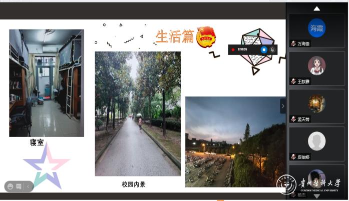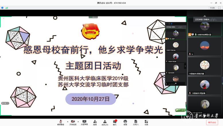 团支部书记罗曼玲通过PPT和短视频的形式汇报了目前同学们在苏州大学学习工作、日常生活、宿舍建设等方面的情况,通过两校学习课程的比较、课外实践的参与、外出参观学习等方面,展现了太阳成交换生同学们良好的精神风貌和昂扬的学习热情。罗曼玲在汇报最后,代表同学们对学校和学院老师的关心表示感谢,她说远在他乡,心怀对知识的渴望,大家一定会用实际行动证明自己,谨记自己贵医人的身份,努力前行,不负众望。