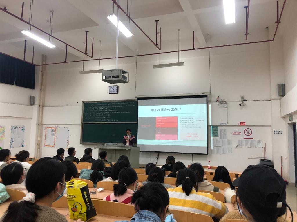 讲座上,田艾主要从就业指导、毕业形势及复试准备几个方面展开,结合自身考研经历,就目前大学生主要的考研问题进行了详细讲解,同时针对考研中易出现的重点问题进行总结、归纳和分析。田艾向同学们强调“扎实的专业知识是复试的敲门砖”、“机会是留给有准备的人”,并重点对于同学们毕业以后的职业规划以及考研之后复试面试等问题,提出了自己的建议意见。