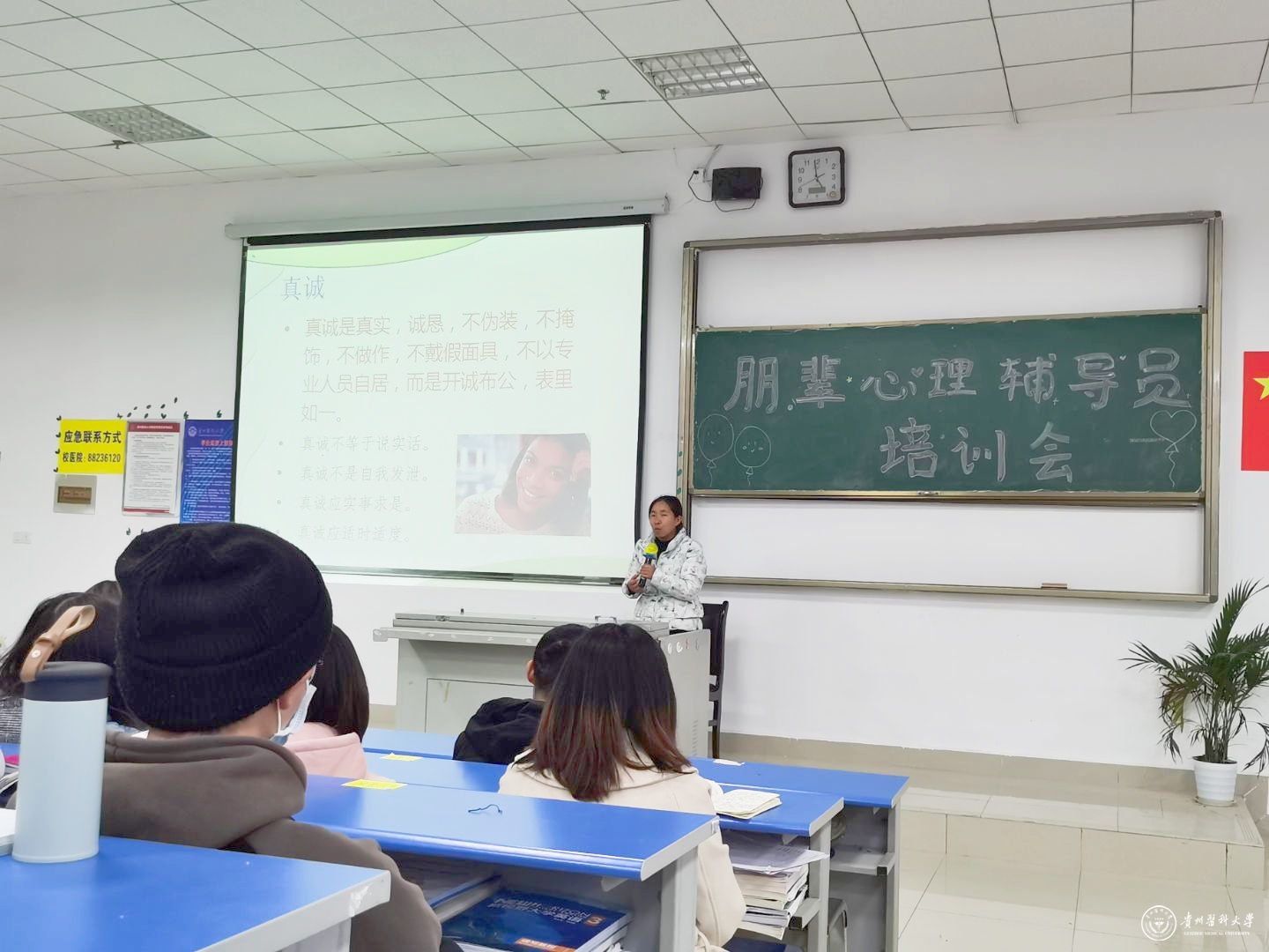 心理中心教师陈玉莲作了题为《心理委员的助人技巧》的培训,介绍了心理委员与同学建立关系的技巧以及心理委员帮助同学的技术,包括倾听、具体化、内容反映等参与性技术。