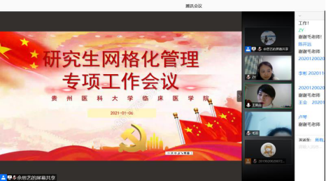 1月6日20时,临床医学院在腾讯会议组织召开研究生网格化管理专项培训会。临床医学院党委书记周红,临床医学院党政领导、全体研究生辅导员、研究生学生干部、校内校外联络员参加。会议由临床医学院党委副书记王筑山主持。