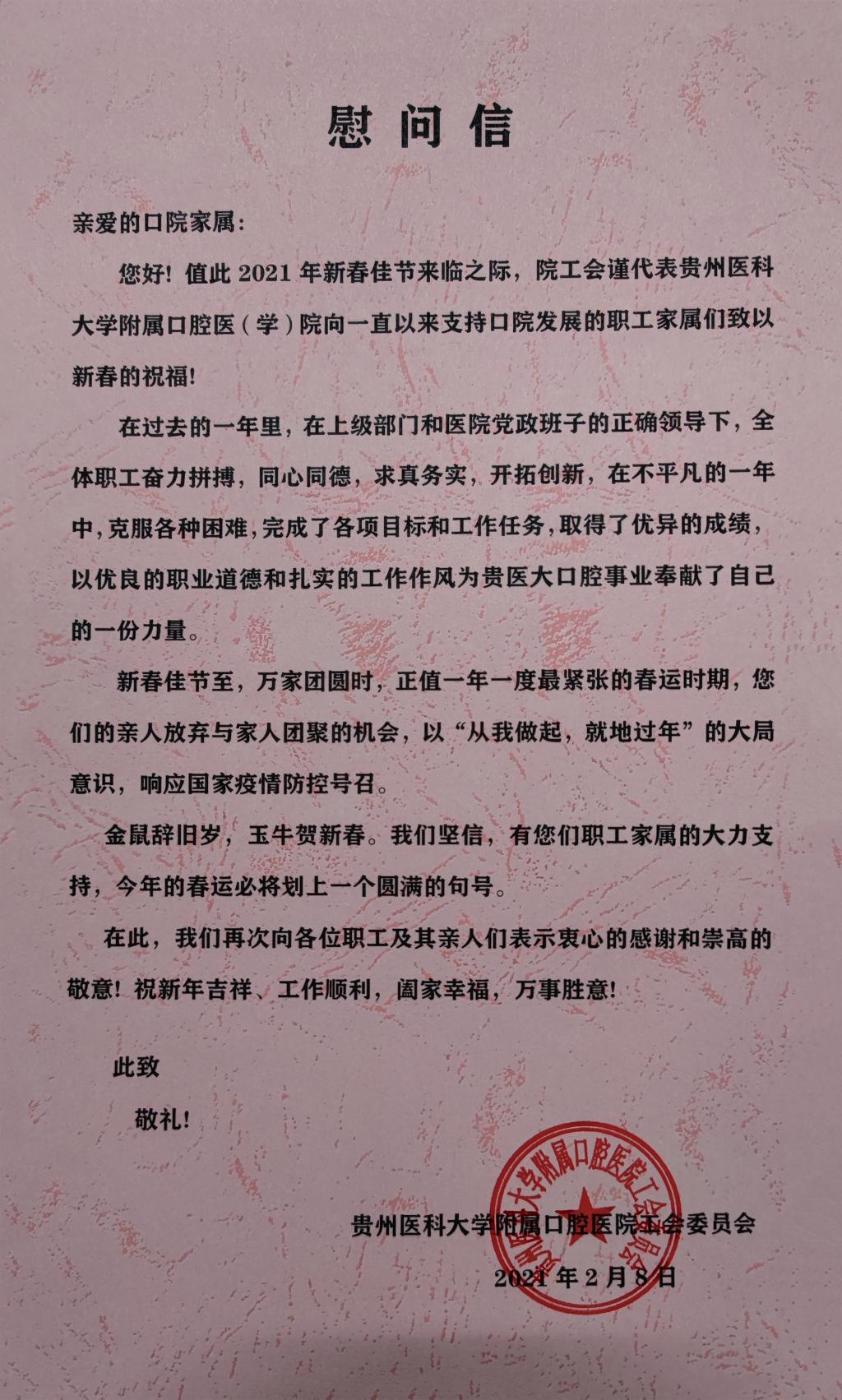 为巩固新冠肺炎疫情防控成果,鼓励引导职工就地过年,2月4日起,口腔医院开展“迎新春送温暖,稳岗留工”活动,将医院慰问信和贵州特产年味礼包,邮寄给职工家乡的亲人,希望家属们能感受到来自贵州的“味道”和心意。除夕夜,职工餐厅为留黔过年的职工准备了年夜饭套餐,让留黔过年的职工能感受到医院对他们的关爱,确保就地过年有关怀、医疗复工有保障、节后工作有支持。