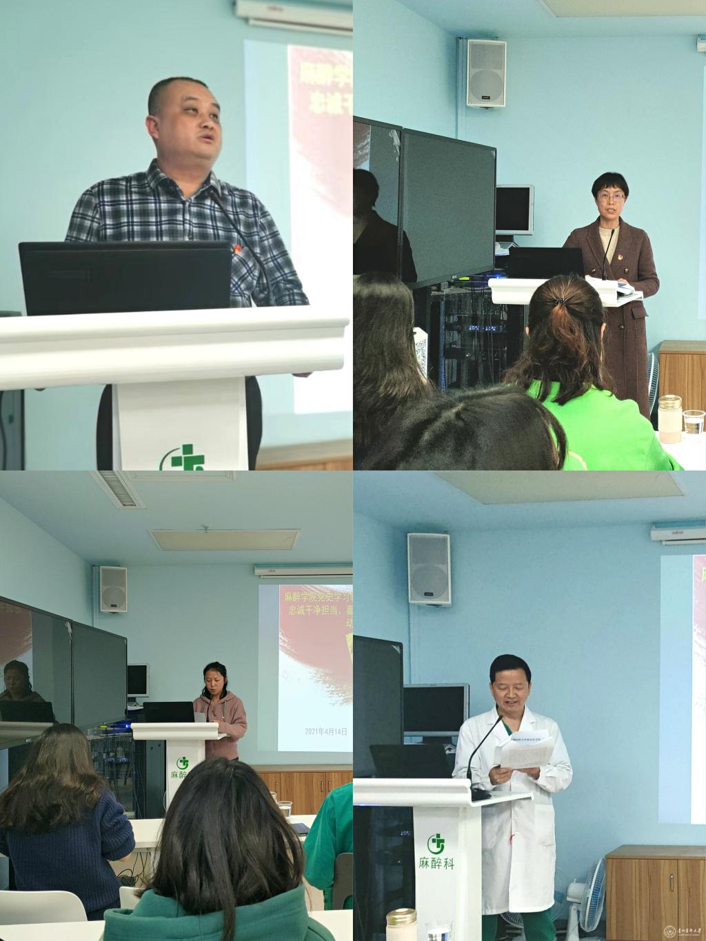 4月14日,麻醉学院在贵医附院第三住院楼麻醉科学习室召开党史学习教育和“牢记殷切嘱托、忠诚干净担当、喜迎建党百年”专题教育动员大会。学院党委班子成员、科室负责人以及全体党员参加。学院正处级组织员黄兰主持。