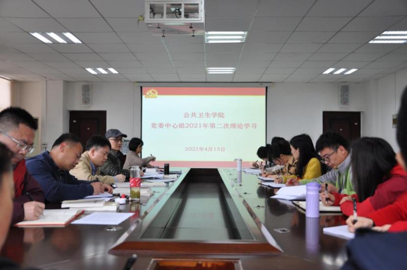 4月15日,公共卫生学院党委理论学习中心组在博雅楼二楼会议室开展2021年第二次集中学习。院长洪峰,副院长李军、张清海,毒性检测中心副主任涂成龙,各党支部书记和支委委员、各科室和学系(中心)负责人参加。会议由院党委副书记何江主持。