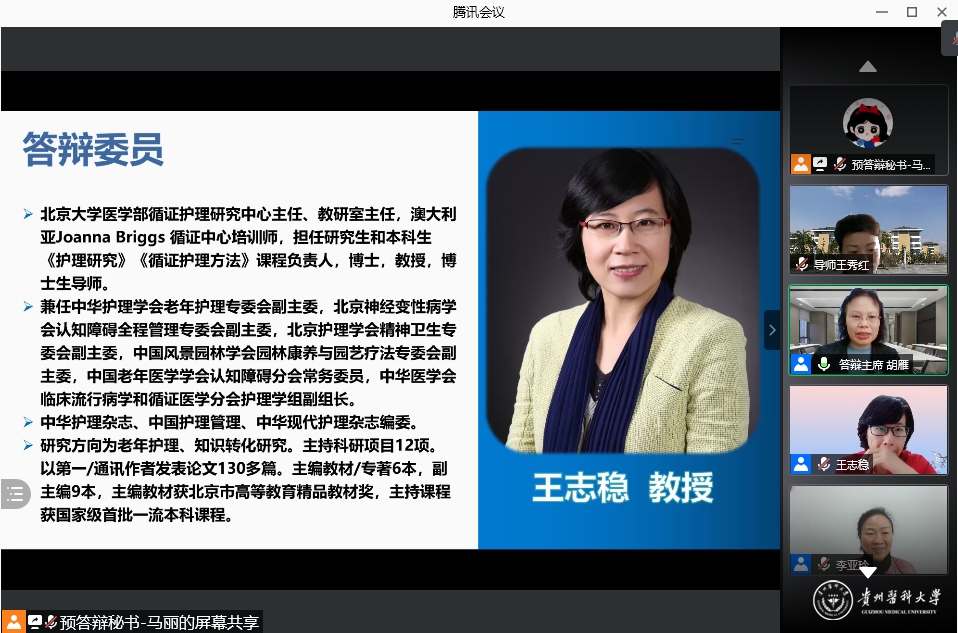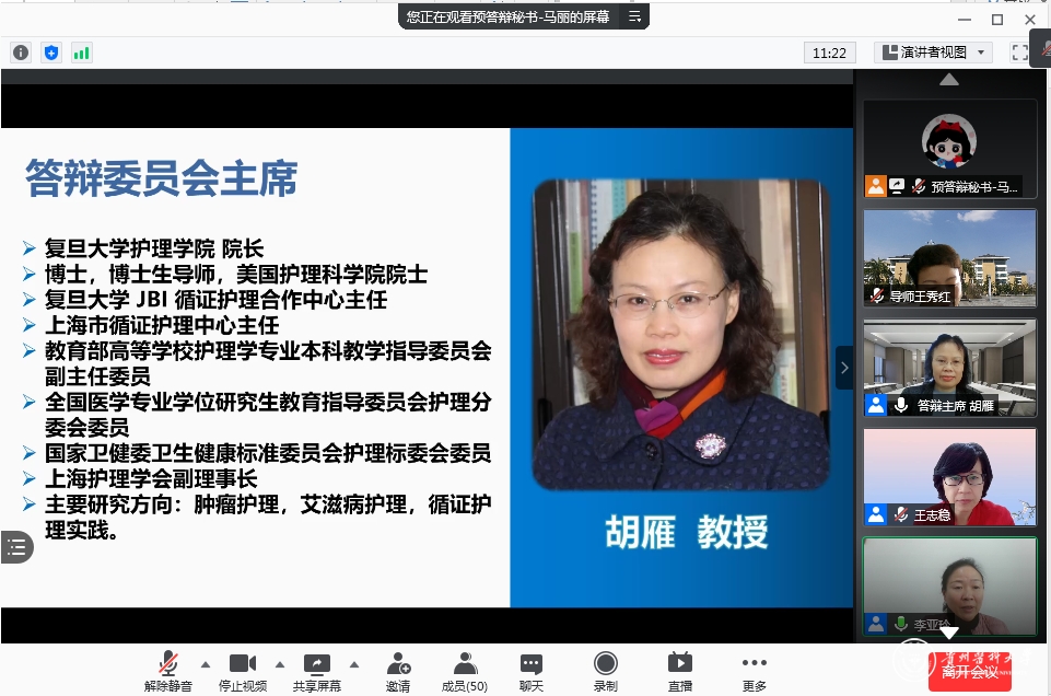 4月20日,护理学院2021届硕士研究生学位论文预答辩通过腾讯会议在线进行。此次预答辩邀请复旦大学护理学院院长、博士生导师胡雁教授任答辩委员会主席,北京大学护理学院博士生导师王志稳教授、太阳成集团tyc33455cc官网附属医院陈腾祥教授、太阳成集团tyc33455cc官网附属医院老年医学科莫显刚主任医师以及太阳成集团tyc33455cc官网公共卫生学院汪俊华副教授担任答辩委员。护理学院导师、副导师、专业教师、研究生等参加,研究生院督导专家全程参与。