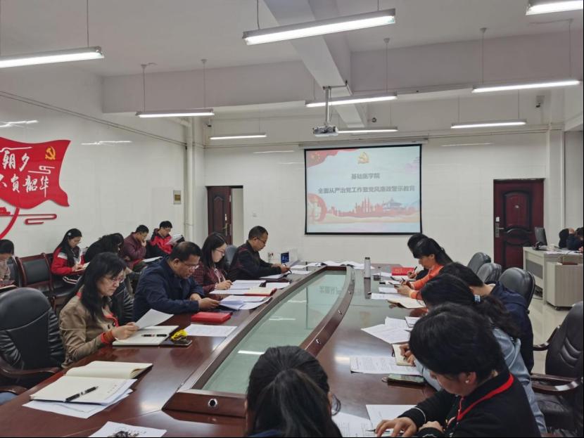 4月21日,基础医学院在南校区务本楼会议室召开全面从严治党暨党风廉政警示教育会。会议由学院党委副书记王妤煜主持,院长禹文峰,副院长张春林、徐红,副处级组织员刘亮,各党支部书记,各职能科室负责人和全体辅导员参加。