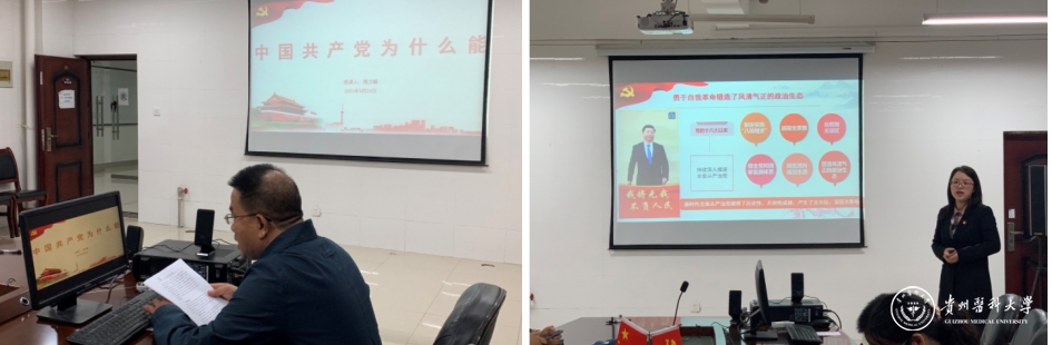 王妤煜从中国共产党有“强大的组织优势、坚实的群众基础、彻底的自我革命”三个方面进一步阐述“中国共产党为什么能”。她讲到中国共产党始终坚持以人民利益为中心,并且勇于自我革命,是我们党最鲜明的品格,是中国共产党的光荣传统。在新冠肺炎疫情防控过程中,共产党人用实际行动让人民有获得感、幸福感、安全感,得到老百姓的衷心拥护和坚定支持。广大师生党员要认真学好四本书——习近平《论中国共产党历史》、《毛泽东邓小平江泽民胡锦涛关于中国共产党历史论述摘编》、《习近平新时代中国特色社会主义思想学习问答》、《中国共产党简史》,在党史学习中汲取奋进力量。