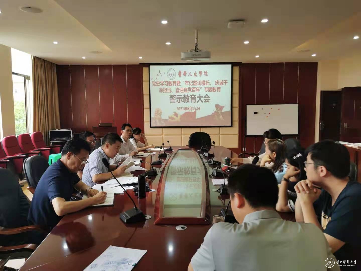 6月15日,医学人文学院在善思楼四楼会议室开展党史学习教育暨“牢记殷切嘱托、忠诚干净担当、喜迎建党百年”专题教育警示教育大会,学院党委副书记张健主持,学院党委班子成员、各科室(中心)负责人、各党支部书记参加。