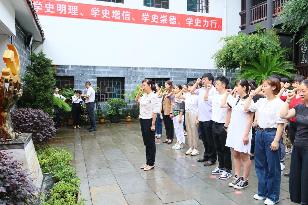 在院党委书记张军梅的带领下,党员们面对党旗,重温入党誓词。