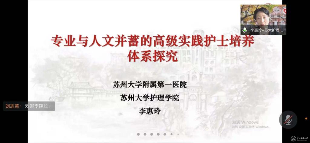 7月21日,护理学院邀请苏州大学附属第一医院院长助理、护理学院院长李惠玲教授通过腾讯会议,为师生开展题为《专业与人文并蓄的高级实践护士培养体系探究》的专题讲座。护理学院党委委员、副院长刘志燕,附属医院护理部副主任蔡鹏、顾颖及研究生导师、副导师、学院和附院相关教师及研究生参加,护理学院党委委员、副院长王秀红主持。