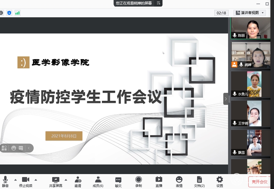 为贯彻落实国家、省市疫情防控工作部署,8月8日,医学影像学院召开线上疫情防控学生工作会议。医学影像学院党委书记李雪梅、党委副书记姚琨及全体辅导员参加。