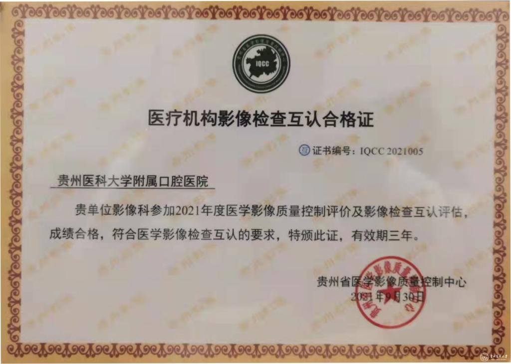 专家组根据《贵州省医学影像检查互认项目质量控制工作实施方案(试行)》对口腔医院进行评估,结果符合医学影像检查互认要求,并进行贵州省医疗机构影像检查结果互认合格证的授牌仪式。