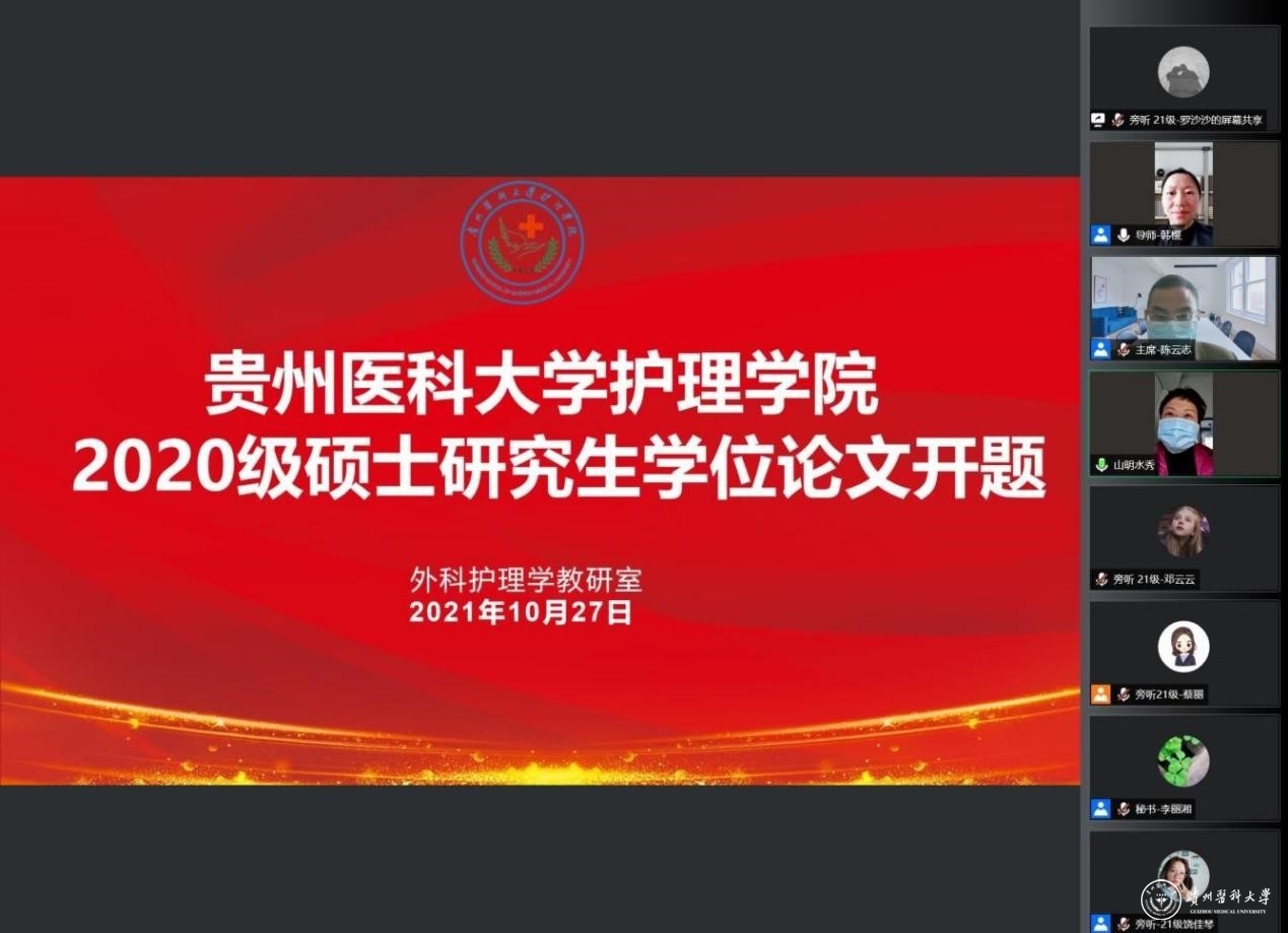 10月26日、27日、29日护理学院2020级硕士研究生开题通过腾讯会议在线进行。此次开题分别邀请中南大学湘雅护理学院郭佳教授、刘民辉副教授及贵州中医药大学陈云志教授任开题委员会主席;北京大学护理学院王志稳教授、 中南大学湘雅三医院健康管理中心秦春香教授、中南大学湘雅护理学院杨敏教授、孙枚副教授和王瑶副教授及《护士进修杂志》主编张秀主任、中山大学中山眼科中心肖惠明主任护师、华北理工大学护理与康复学院陈长香教授、广州市护理学会会长黄雪仪主任护师、贵州中医药大学护理学院石国凤教授、太阳成集团tyc33455cc官网公共卫生学院流行病学与卫生统计学王子云副教授和汪俊华副教授等担任开题专家委员。护理学院导师、副导师、专业教师、研究生等共计参会150人次,研究生院督导专家全程参与。