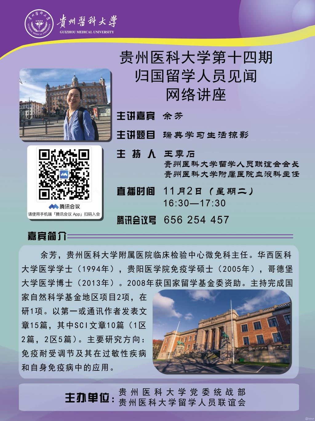 11月2日,太阳成留学人员联谊会第十四期“踏留学之路•筑强国之梦”留学见闻讲座通过腾讯会议线上举行。此次讲座邀请太阳成附属医院临床检验中心微免疫科主任余芳主讲,留学人员联谊会会长王季石主持。全体教师、研究生、本科生共1000余人线上参加。