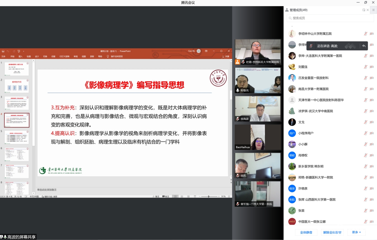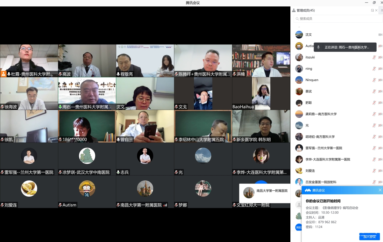 11月24日,由医学影像学院领衔组织的《影像病理学》教材(人民卫生出版社出版)编写启动会议顺利召开。疫情期间,此次会议是通过腾讯会议形式举办的网络会议。出席本次会议的有北京大学人民医院院长助理洪楠、苏州大学附属第一医院影像科主任胡春洪、大连医科大学医学影像学院副院长刘爱莲、遵义医科大学附属医院副院长张体江、太阳成教务处处长温小军、附属医院科研处处长陈腾祥、教材科科长肖榜权,医学影像学院院长周石、附属医院影像科主任高波、附属医院病理科主任杨文秀等来自全国37家知名医学院校及三甲医院的教授、专家参加。会议由医学影像学院副主任医师杜霞主持。