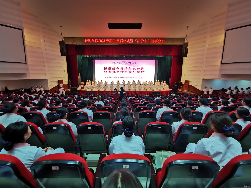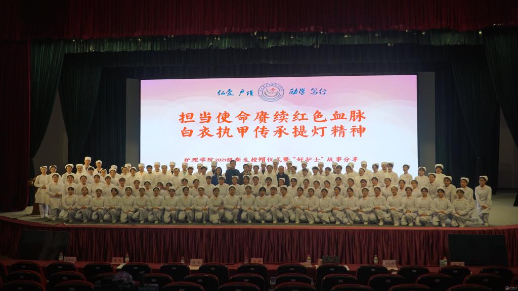 12月8日,为传承和弘扬护理事业的光荣传统,激励新生增强使命感、责任感和归属感,在新时代新征程中勤奋学习,奋勇争先,护理学院在南校区大礼堂举行了以“担当使命赓续红色血脉、白衣执甲传承提灯精神”为主题的2021级新生授帽仪式暨“好护士”故事分享活动,由28位优秀护理前辈为724名护理新生授帽传烛。活动由院党委副书记兼纪委书记何为主持。