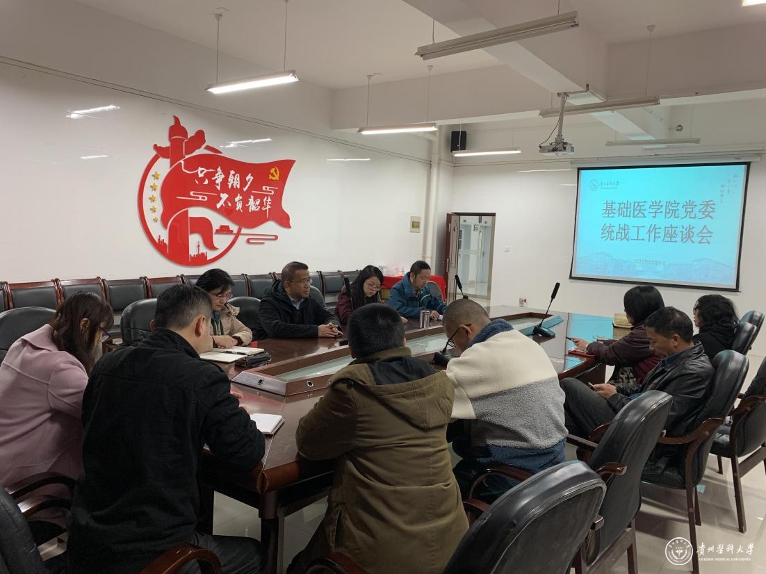 12月9日,在务本楼会议室召开党委统战工作座谈会,基础医学院党政领导、学院各民主党派代表、无党派人士、群众教师代表参加。座谈会由学院正处级组织员孟立科主持。