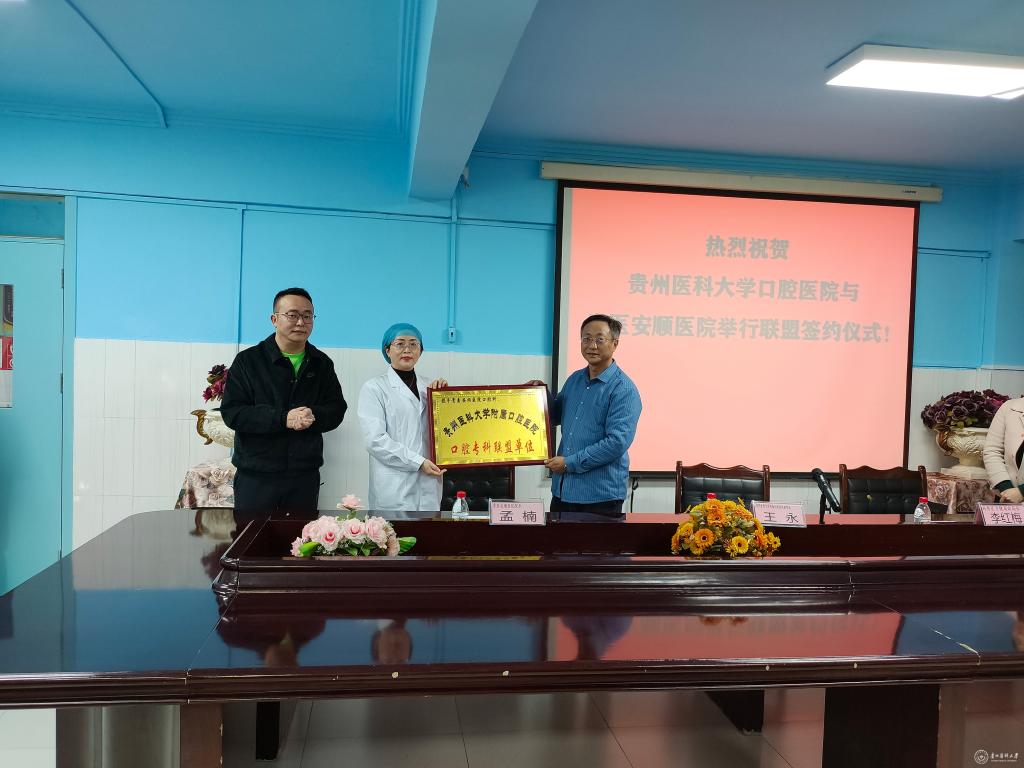 12月6日,太阳成集团tyc33455cc官网附属口腔医院应贵医安顺医院邀请,由附属口腔医院副院长王永带领医务科负责人高琼、医务科秘书李炳洲、党委办公室曾诚赴安顺召开座谈会并举行专科联盟成员单位签约授牌仪式。安顺市西秀区卫健局副局长李红梅、贵医安顺医院院长孟楠、口腔科主任吴兰和医护人员参加活动。贵医安顺医院党支部书记陈星主持座谈会。