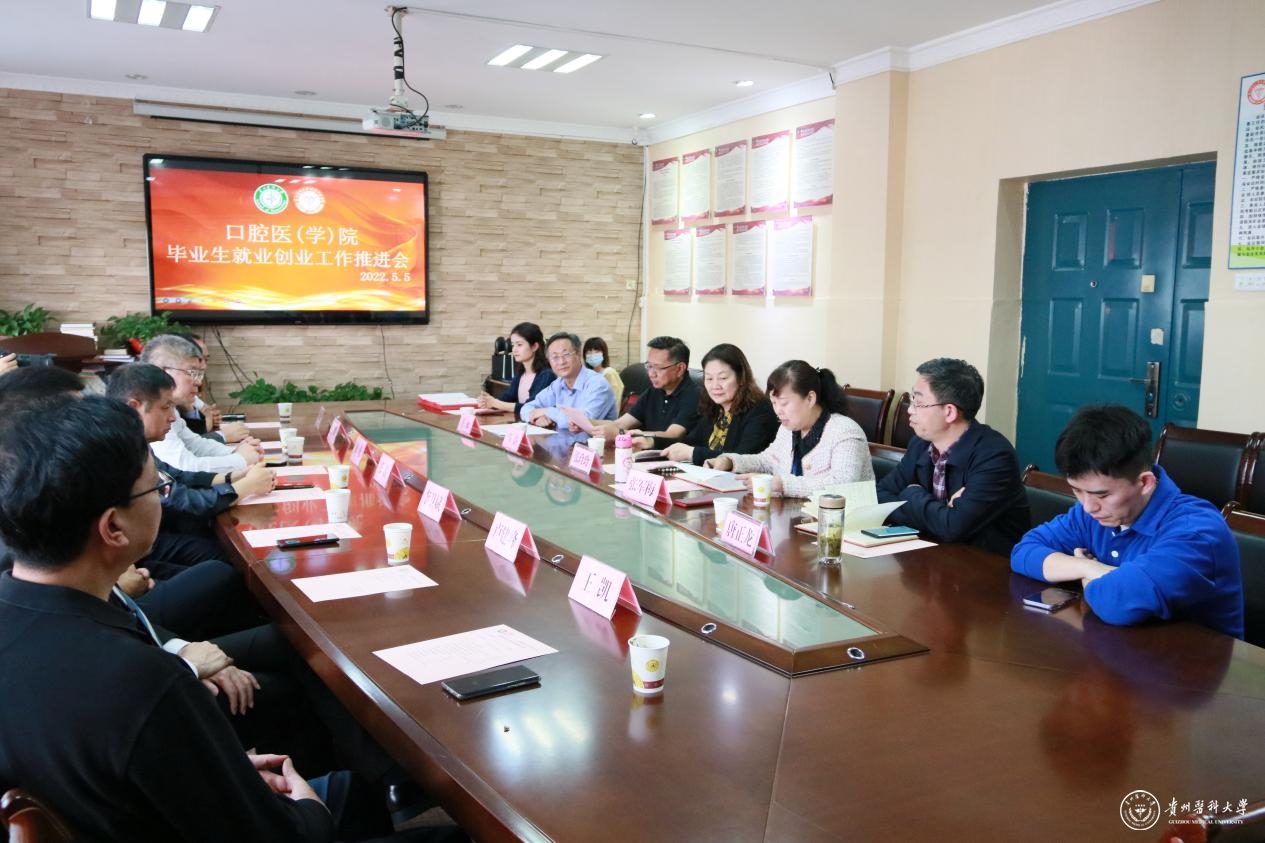 为进一步贯彻落实上级部门关于推进大学生就业创业工作的部署要求,5月5日,口腔医学院在行政楼会议室组织召开了毕业生就业创业工作推进会,聘请7位口腔行业专家作为导师,为毕业生就业创业保驾护航。贵阳市口腔医院门诊部主任张磊,中华口腔医学会民营医疗分会常务理事、副会长李卫斌,贵州省口腔学会民营口腔学会副会长黄勇,德韩集团副总裁兼贵州片区总经理卢建峰,德韩口腔医疗集团贵州片区医疗院长王胜,京州口腔医疗集团医疗部副主任、遵义地区总院长王凯,黔西南州京州口腔医院院长郑六林,后勤管理处党总支书记张玲玲,口腔医学院党委书记张军梅,院长马洪,副院长唐正龙及部分职能科室主任出席会议。口腔医学院副院长王永主持。