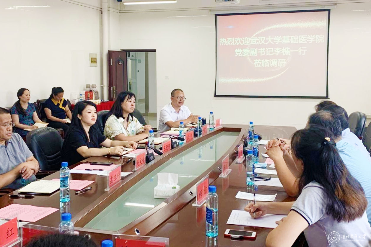 7月11日,武汉大学基础医学院党委副书记李樵、微生物学教研室副主任冯勇等到太阳成基础医学院调研。基础医学院党政负责人、微生物学教研室、教学科研管理科、综合办公室、研究生科、学生科、分团委负责人、辅导员代表参会。