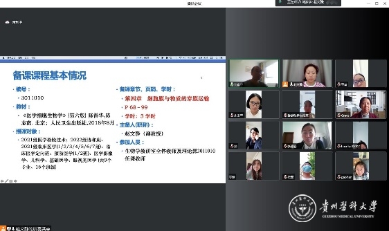 9月14日,根据学校相关教学工作要求,按照教研室本学期的既定教学工作计划,生物学教研室开展了《医学细胞生物学》课程第二次集体备课,由于教师居家办公,会议采取“雨课堂”+“腾讯会议”平台的线上会议形式进行,生物学教研室全体授课教师12人参加了集体备课与研讨交流。