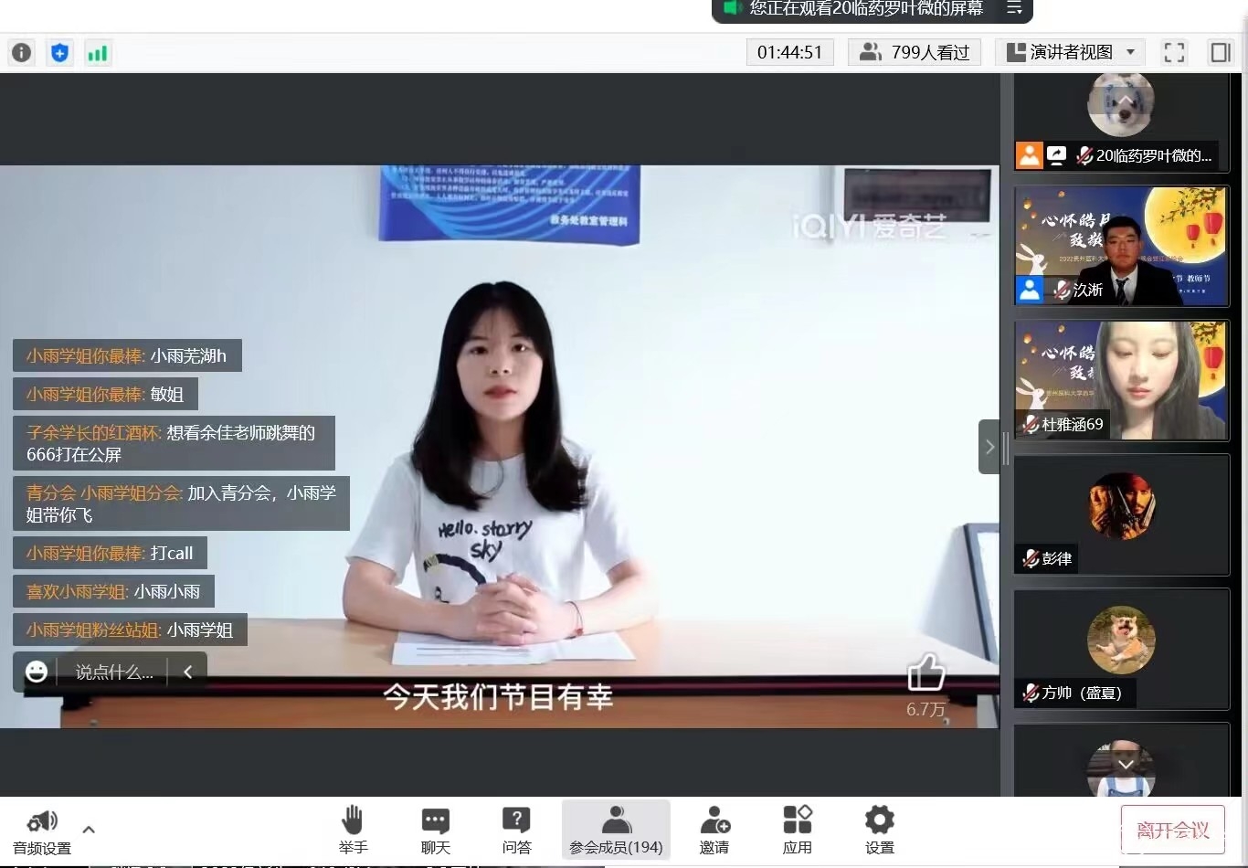 今年的中秋节与教师节不期而遇,这注定是一个不平凡的“双节”。在这特殊的时期里,9月10日晚,药学院举办“心怀皓月,致敬师恩”文艺晚会。学生给老师写信表达了药学学子对老师的祝福及对战胜疫情的坚定信心。学生精心准备了十几个节目,师生在线上欢度中秋节,喜迎教师节的同时不忘致敬奋战在抗疫一线的英雄们,双节双庆共团圆,携手同心抗疫情!