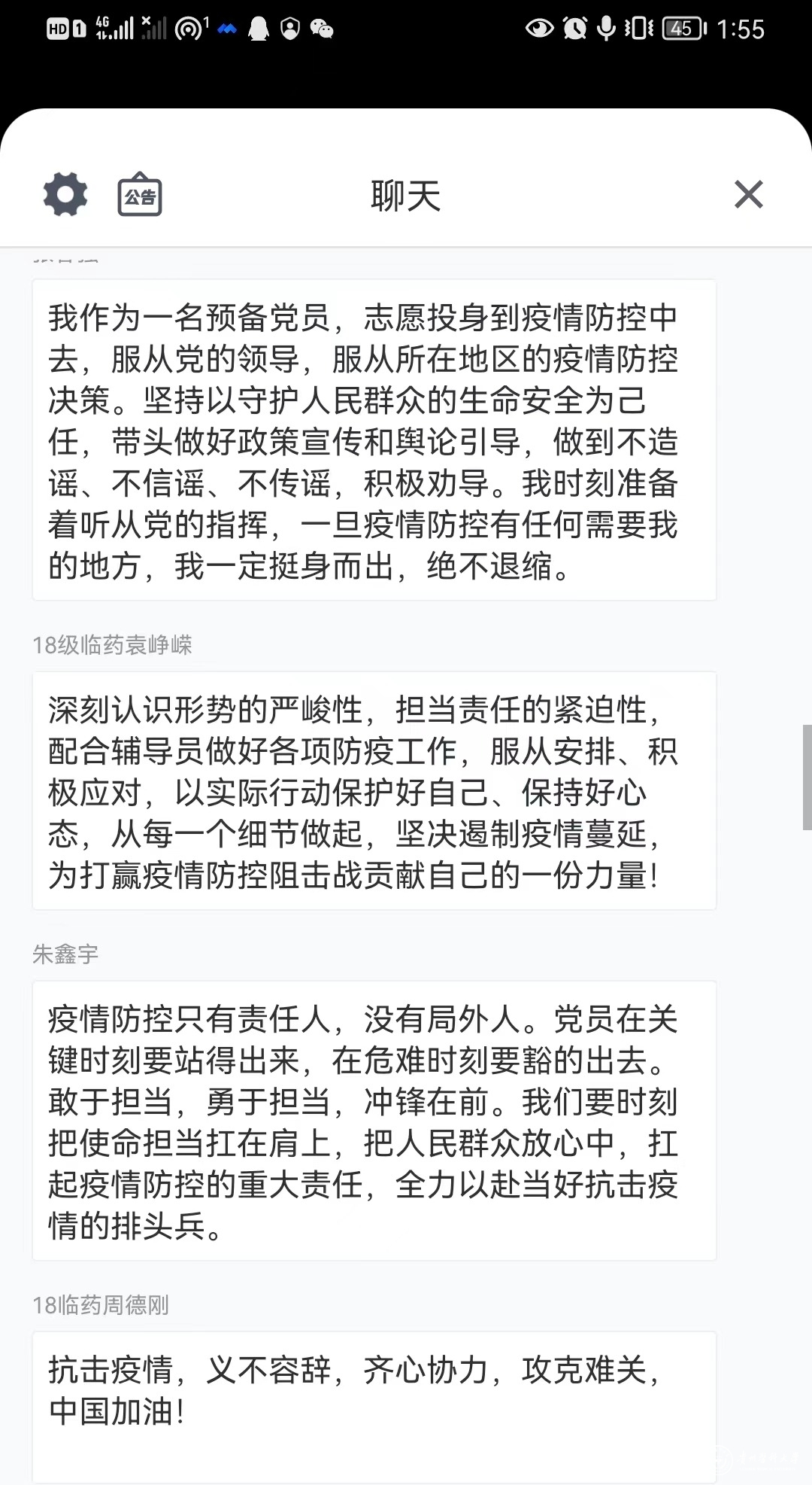 药学院党委就疫情防控工作总体部署后,学生党支部立即组织召开支部党员大会,传达学校疫情防控工作重要指示精神,要求全体学生党员要把思想和行动统一到疫情防控工作中,积极参与志愿者服务,做到团结一致,共克时艰。学生党员在收到志愿者招募的通知后,纷纷响应号召,主动请战。“作为一名大学生党员,在人民群众需要的时候挺身而出是应有的责任。”每一位党员都用实际行动践行着自己的入党誓词。坚决以实际行动发挥党组织的战斗堡垒作用和党员的先锋模范作用,要让党旗飘扬在战“疫”第一线。