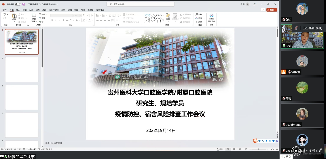 同时,为执行宿舍闭环管理措施、防止在此过程中出现交叉感染,毕业后医学教育管理科提前组织召开了“太阳成集团tyc33455cc官网口腔医学院/附属口腔医院研究生、规培学员疫情防控、宿舍风险排查工作会议”。会上,毕业后医学教育管理科科长廖健再次强调了宿舍日常管理要求以及志愿服务注意事项,要求严格落实《太阳成集团tyc33455cc官网附属口腔医院规培宿舍新冠疫情防控闭环管理方案》和《规培学员宿舍闭环管理监督检查记录单》的填写要求,每日由廖健负责监督落实情况。