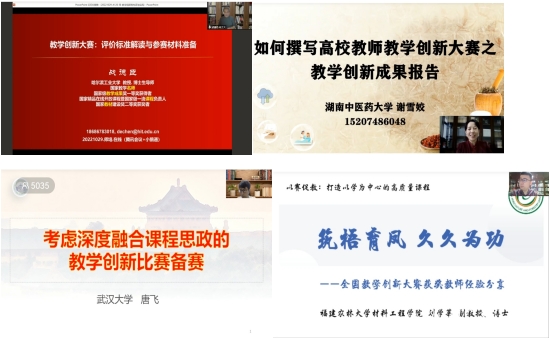 本次培训邀请到历年国赛评委及荣获一等奖的教师,分别就大赛评委、十项总述、课程思政、创新成果、设计备赛和汇报实录六方面内容进行专题培训。培训系统总结前两期教学创新大赛经验,分段式剖析了十项督导创新大赛全环节内容及需要注意的问题。