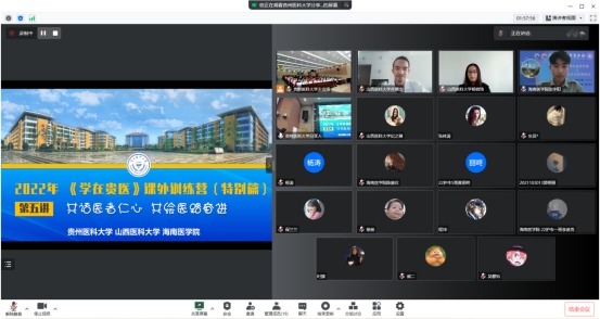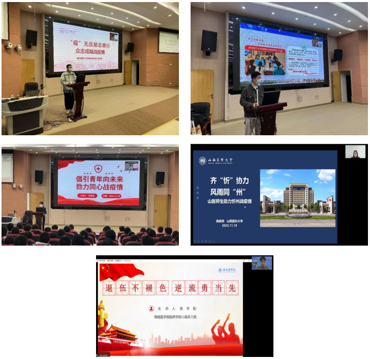 太阳成基础医学院的杨泽羊、护理学院的孙念祖、公共卫生与健康学院的徐子轩和山西医科大学的杨晓琦、海南医学院的张宇阳分别分享抗疫经历和经验。杨泽羊作为太阳成支援南明区二戈寨方舱核酸检测实验室和观山湖区气膜核酸检测实验中心的青年突击队成员,讲述了核酸样本处理、后勤保障工作中的辛苦与感动;孙念祖在一个月的抗疫战斗中,一直坚守在北京路校区和花溪区核酸采样工作的第一线;徐子轩驰援南明区疾病预防控制中心指挥部,参与流行病调查和统计分析工作,为疫情的研判助力贵医力量;杨晓琦目前仍在山西忻州疫情的前线,为我们带来了相关防控知识和他们的战疫故事;脱下军装绿,换上志愿蓝的张宇阳分享了自己在三亚疫情期间的所思所想、所做所为,诠释了“退伍不褪色”的退役军人本质。