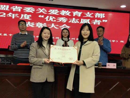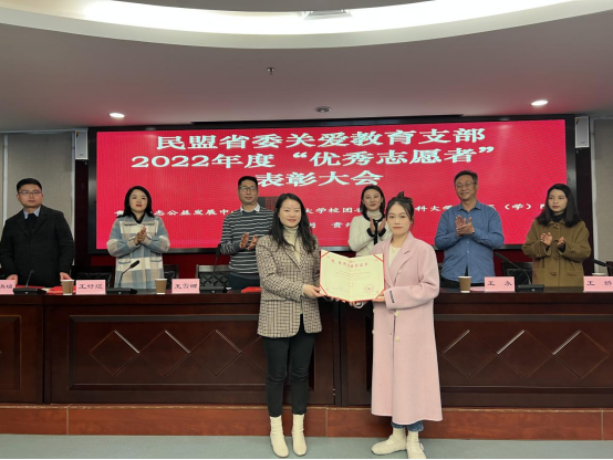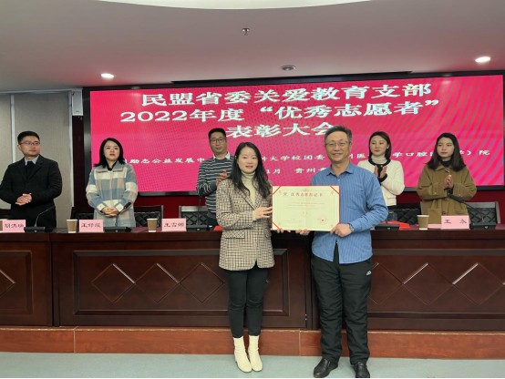 贵州省励志公益发展中心党支部书记王雪娜,民盟贵州省委关爱教育支部主委、贵州省励志公益发展中心秘书长周巧明对荣获2022年度“优秀志愿者”荣誉称号的同志表示祝贺,希望在新的一年里,继续在支医支教、教育扶贫及关爱空巢老人、留守儿童等领域与学院及医院深入合作,共同助力乡村振兴。