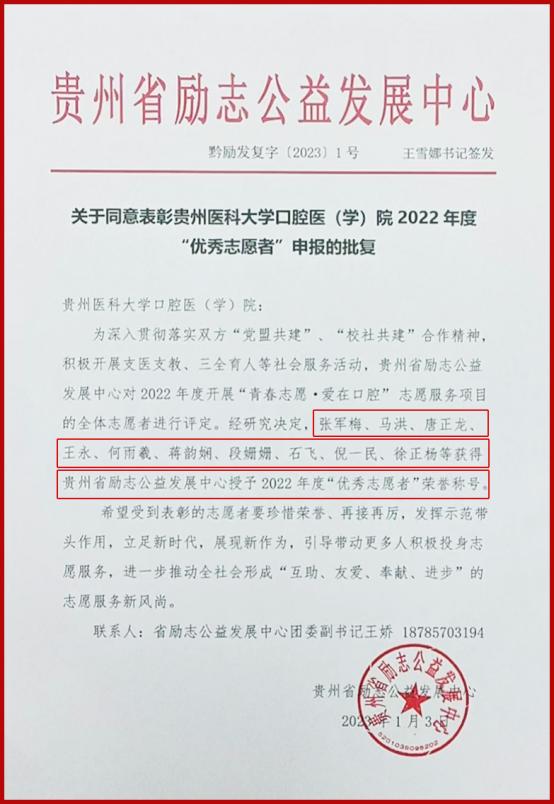 1月14日,由民盟省委关爱教育支部、贵州省励志公益发展中心共同举办的2022年度“优秀志愿者”表彰大会在贵州省政协大楼601会议室举行。太阳成集团tyc33455cc官网口腔医学院、附属口腔医院10人荣获大会2022年度“优秀志愿者”荣誉称号,院党委副书记何雨羲、副院长王永等相关人员受邀带队参加表彰大会。
