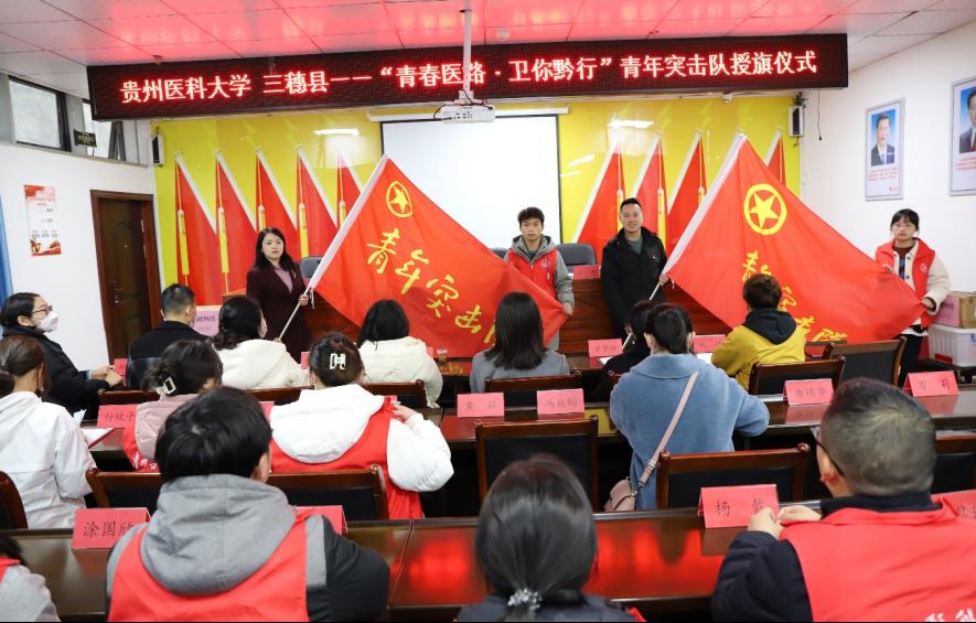 在三穗县文笔街道新穗村党群服务中心,校团委全体人员、省励志公益发展中心、三穗县团委、三穗县文笔街道新穗村相关人员和当地贵医学子参加了“青春医路 卫你黔行”青年突击队授旗和物资捐赠仪式。冉颖致辞,他表示组建贵医三穗籍青年突击队,深入开展青年突击队青春建功行动,是跨区域团团共建的实践探索,是一次对口帮扶助力乡村振兴的鲜活事例。