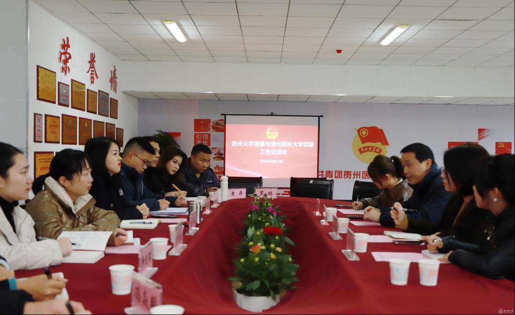 2月21日,贵州大学团委书记刘魁、副书记杨晓椿一行到太阳成团委调研交流共青团工作。太阳成团委书记王妤煜、副书记胡洪瑞、各科室老师参加座谈会。